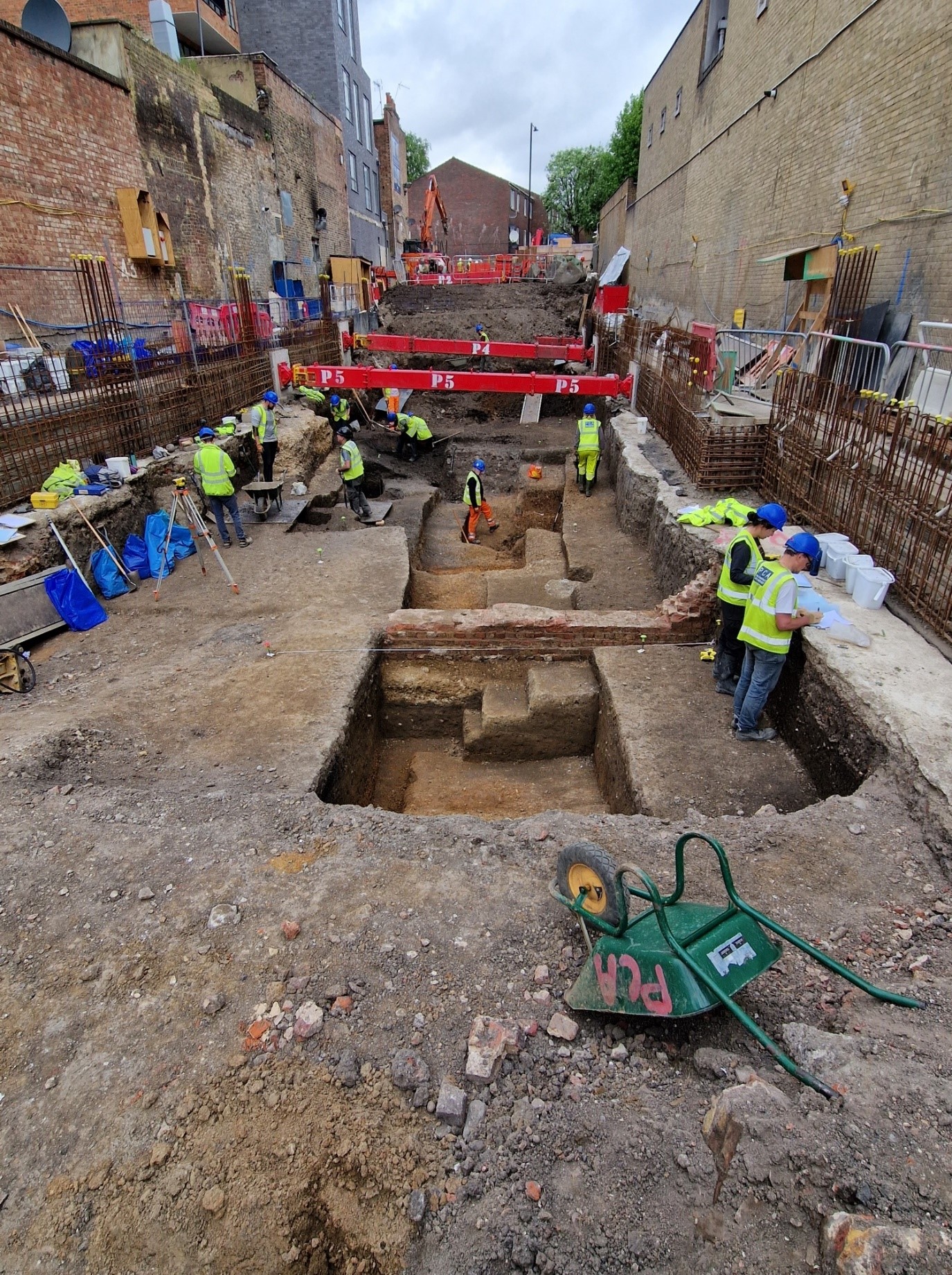 The depth of excavation and constrained space made the site logistically challenging, and close cooperation with the principal contractor was needed to ensure the archaeology and construction works proceeded as efficiently as possible. Heavy bombing of the area had occurred during the Second World War necessitating specialist unexploded ordnance (UXO) contractors attending full time. Excavation continued area by area, generally progressing toward the north of the site.