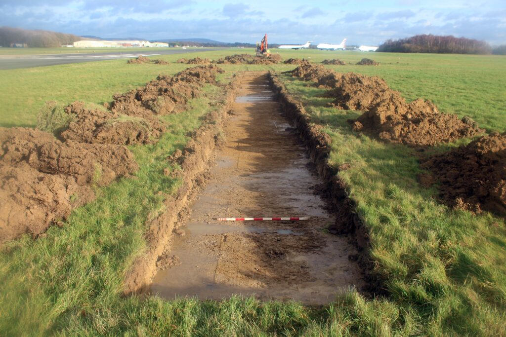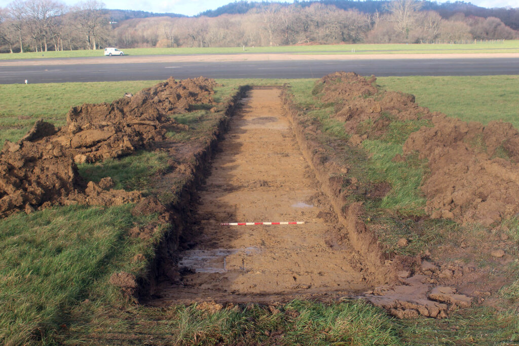 Previous archaeological works had revealed two enclosure ditches, one of which was assigned a Roman date. Cremation burials, roundhouses and post-medieval evidence were also excavated. As a result, the archaeological potential of the aerodrome works was undeniable.