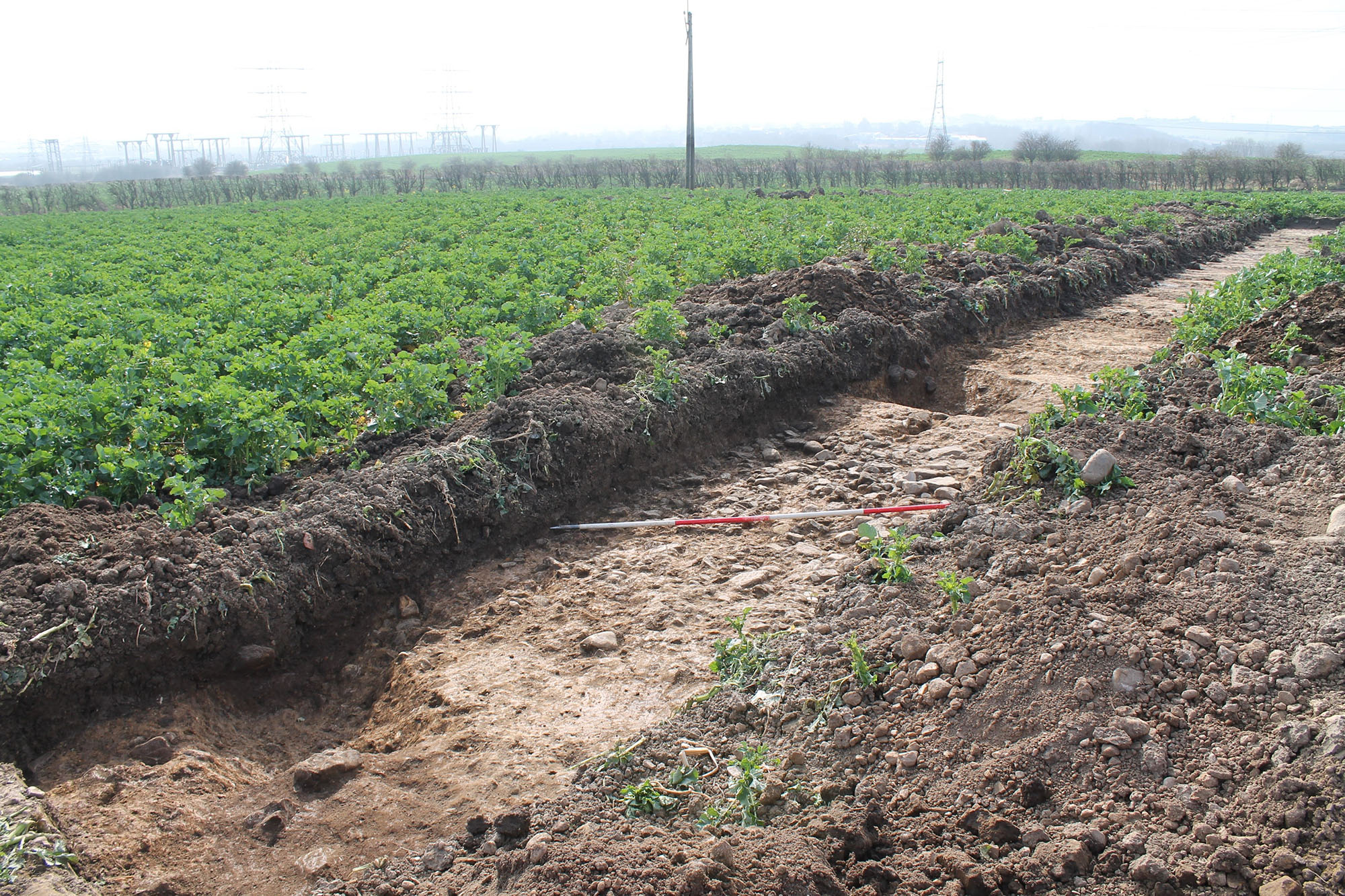 The initial phase of trial trenching involved investigated potential archaeological assets identified by the geophysical survey. Six phases of activity were encountered at the site, including a possible Iron Age sub-square enclosure, Roman features comprising ditches; postholes; gullies; a pit; and a road with roadside ditches, post-medieval features including agricultural drainage ditches and former field boundaries, several undated features and deposits that were located away from dated archaeological remains and could not be associated with any monument type and modern backfill of field boundaries and ploughsoil. A report on the findings was produced to satisfy planning conditions.