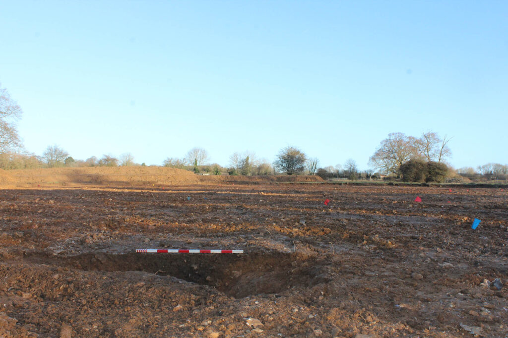 The archaeological evaluation comprised 39 trenches measuring 30m x 2m. The array of trenches sought to provide a sample of the site order to establish its archaeological potential. The evaluation revealed archaeological features, mainly focused on the centre of the site; nine linear intrusions and four small pits or postholes. Six of the nine linear features identified contained finds dated to the Late Iron Age/ Early Roman period, three of the four pits were also dated to this period by the finds. While the features do not indicate any readily identifiable site type, the relatively large quantities of pottery recovered suggests this activity is probably related to a small settlement or farmstead with field or enclosure boundaries, ditches, and pits.