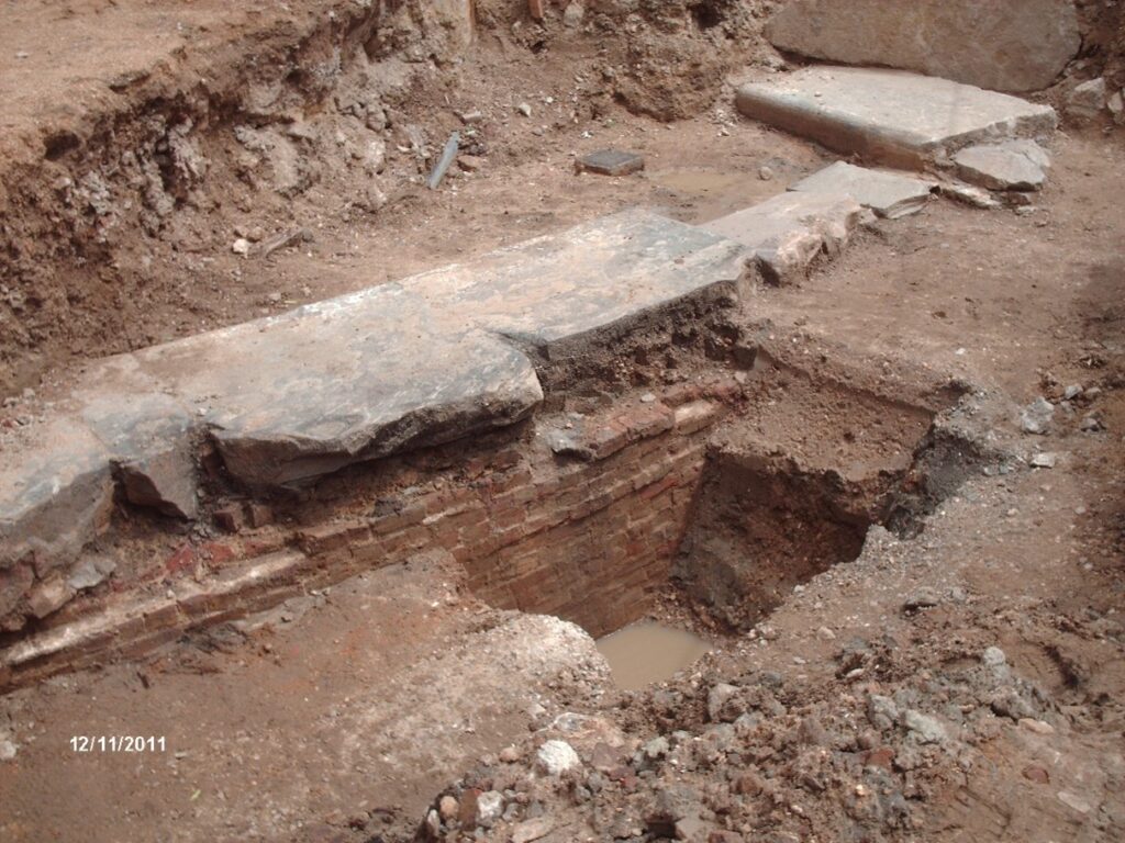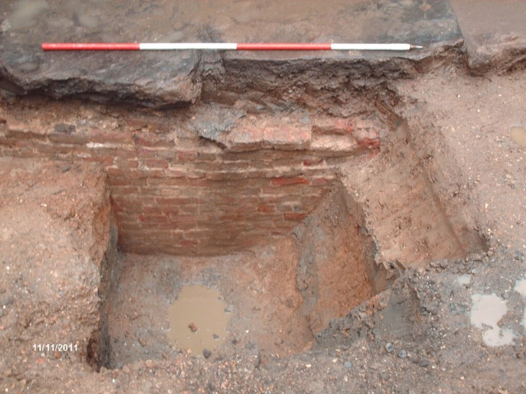 The evaluation consisted of a single trench 10m x 2m x 2m and revealed an 8.55m length of the lock canal. It was made of red brick laid in English coursing and capped by worked stone slabs. In the southeast corner of the trench, a rebate was recorded in the masonry into which the south-western lock gate would have recessed when open. The fieldwork has therefore confirmed that the lock and dock positions are approximately accurate to the historic maps.