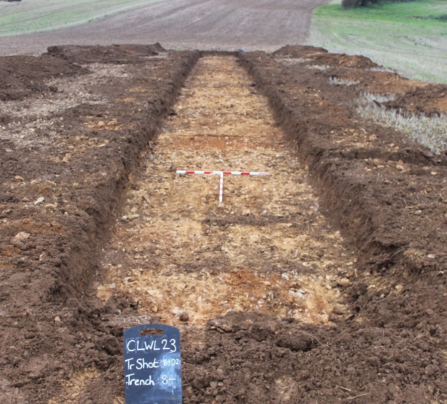 The site was in an area of known archaeological potential including cropmarks of prehistoric date, including a possible settlement, and a Roman road and a villa to the west and southeast of the site respectively. A geophysical survey at the site revealed an enclosure of Iron Age or Roman date and possible prehistoric boundary ditches and trackways as well as traces of ridge and furrow.