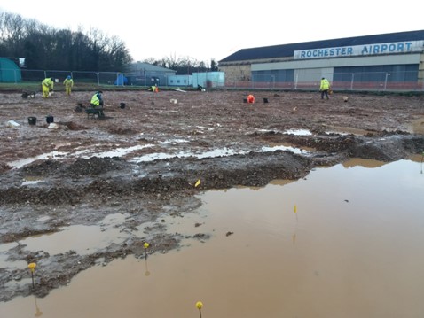Pre-Construct Archaeology London undertook simultaneous Historic Building Recording and archaeological evaluation, followed by open area excavation, to facilitate several new structures at Rochester Airport: two hangars for the airport itself, a new hangar for the Medway Aircraft Preservation Society (MAPS), installation of a new fuel-tank enclosure, helicopter pads, creation of a memorial garden and the formation of new car parking as well as access routes. The site was located at the southern end of Rochester Airfield where there was already a number of existing hangars and office buildings, areas of hardstanding, access roads and grassed areas for aircraft parking.