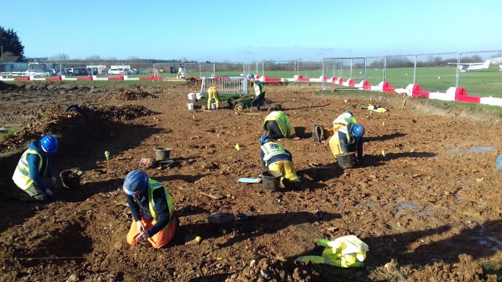 The excavation was challenging due to some very wet weather over the winter months making conditions on the clay site less than ideal for fieldwork. Operating in close proximity to aircraft also required regular scaping and sweeping of the access road dividing the area, and strict control of tools and materials to limit the possibility of foreign objects being introduced into rotors and engines.