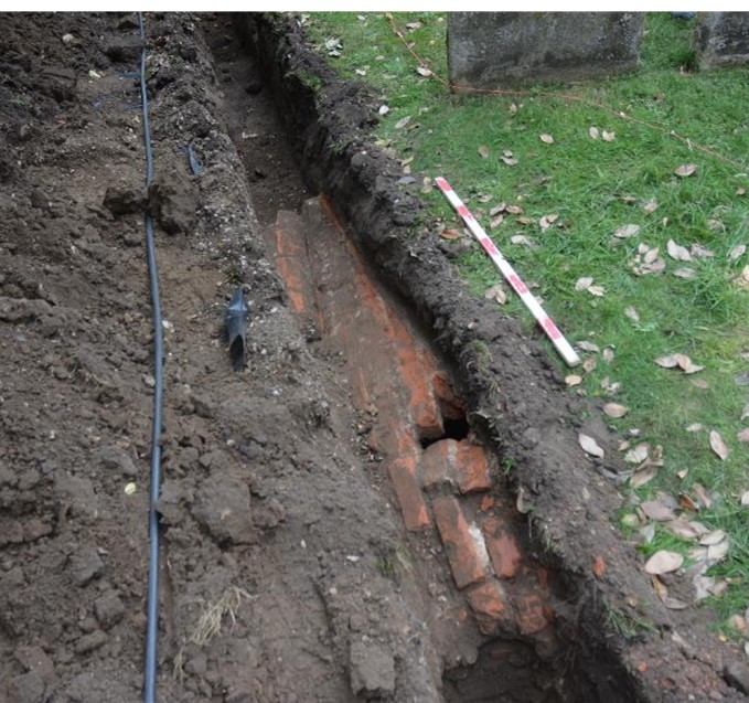 Below a layer of turf was one of made ground that contained a number of disarticulated human bones, representative of at least four individuals that were probably redeposited when the churchyard was landscaped in 1873.These were collected, recorded and given back to the church for reburial. Any undisturbed burial horizon is likely to have been below the lowest level of the service trench. No archaeological features were observed although a late 18th – 19th century brick vaulted tomb was observed and was preserved in situ.