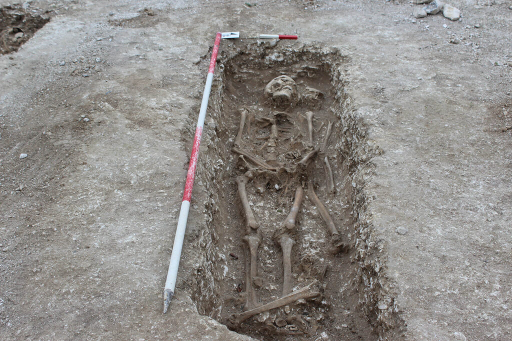 Based on information gained through similar evaluation works predating PCA’s involvement on the site, the recent programme centred on the excavation of human burials as well as focussing on several geophysical anomalies which were reminiscent of prehistoric round barrows, near the north-east corner of the site. The topsoil strip revealed three truncated Bronze Age round barrows. Associated with these earthworks, over 130 inhumation burials dating to the Saxon period, as well as two Bronze Age cremations, three prehistoric burials, and one Roman burial, were also uncovered. This is a particularly interesting and important site archaeologically because it presents evidence of long-term continuous use of a mortuary site over multiple time periods.