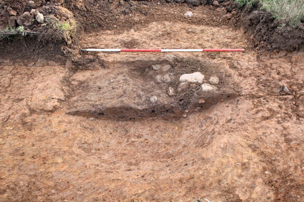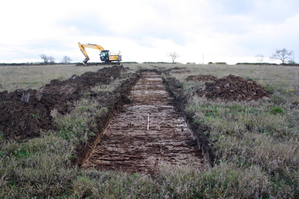 The archaeological evaluation works comprised the excavation of some 193 trenches spread across 13 fields, with each trench measuring 30m by 2m to target anomalies identified in an earlier phase of archaeological geophysical works as well as providing a wider sample of the site. The programme of trial trenching in total comprised a 4% sample of the proposed development area.
